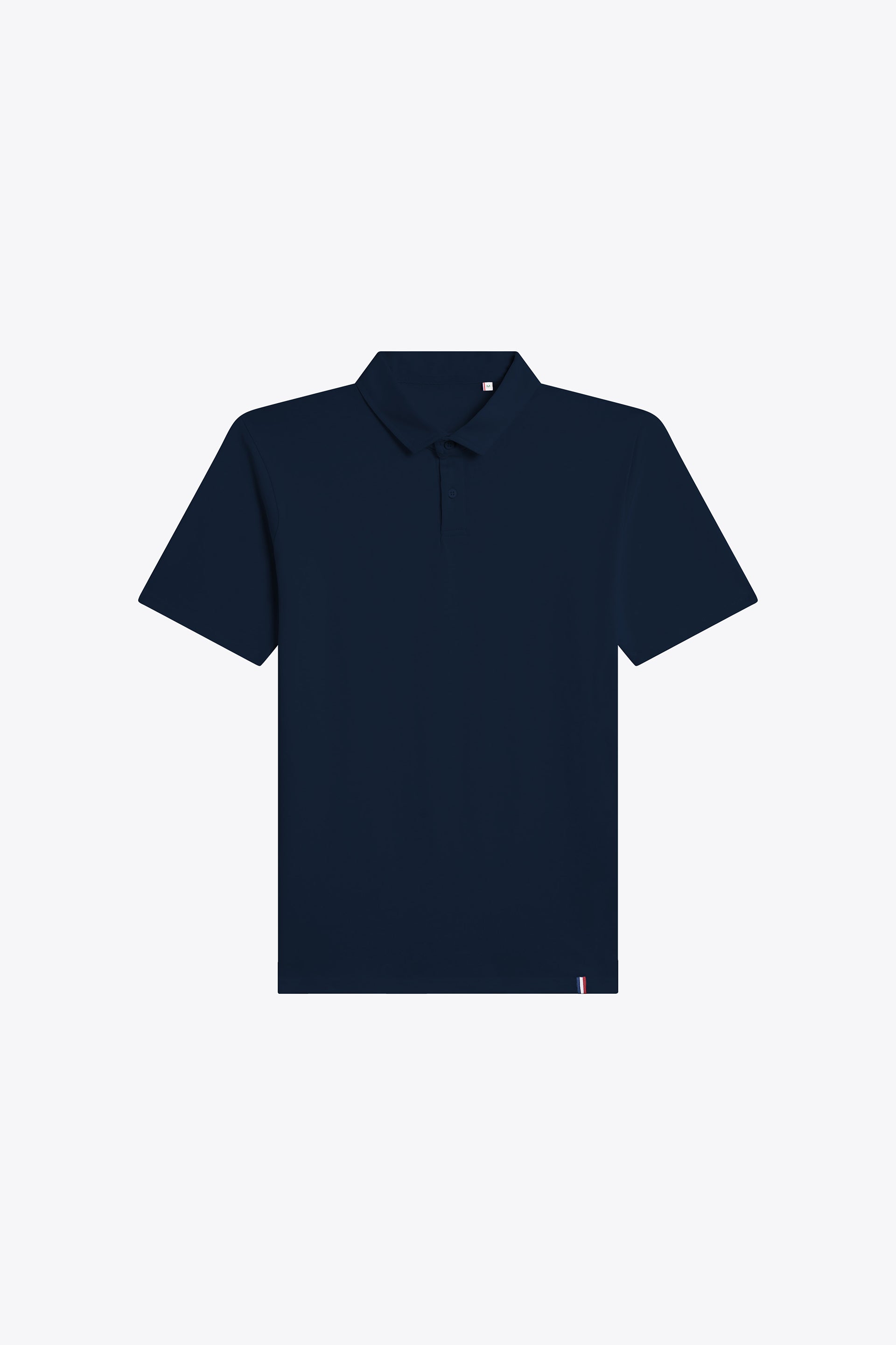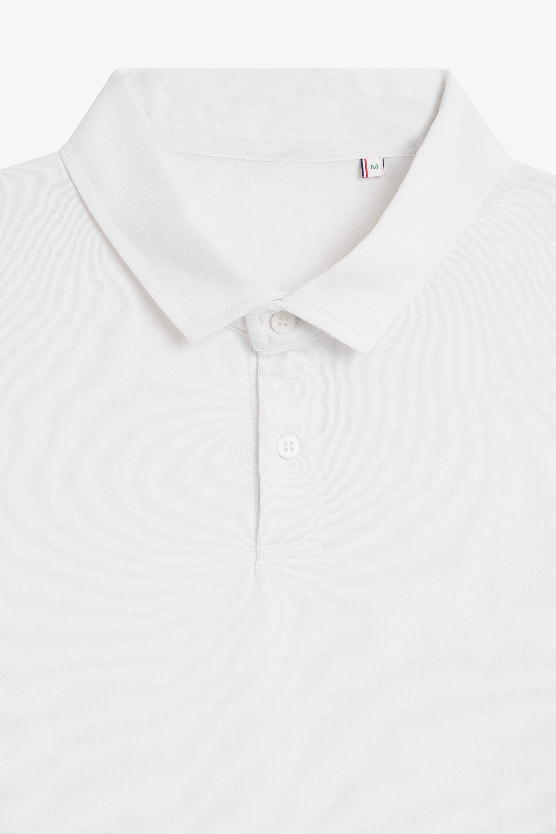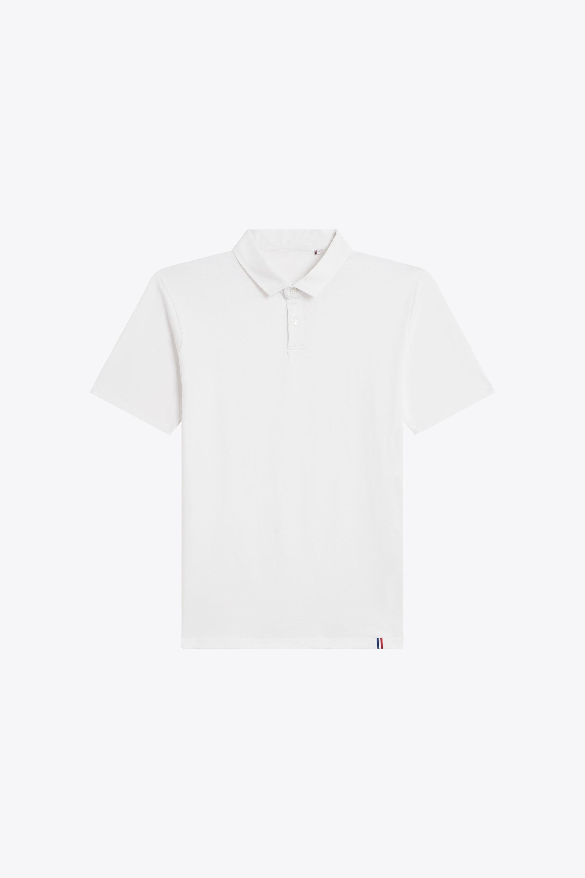 Coupe standard, coupé cousu, col à patte, avec détail tricolore en bas à gauche.
