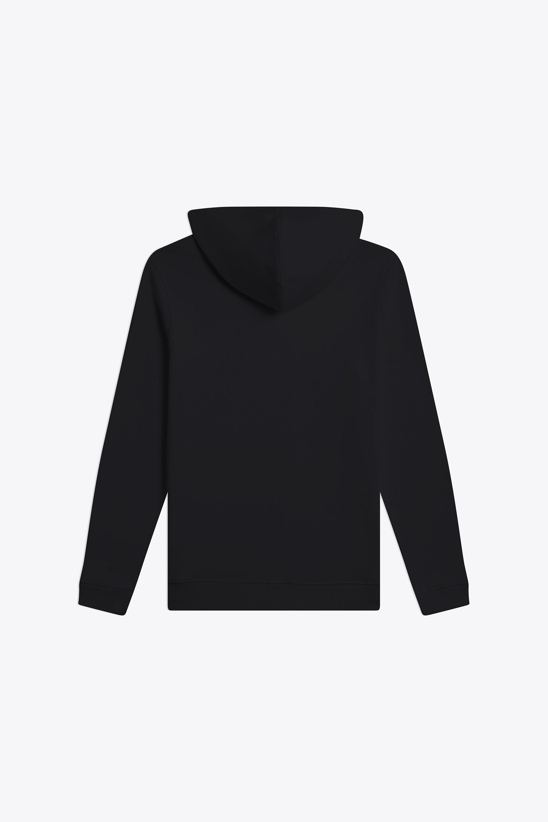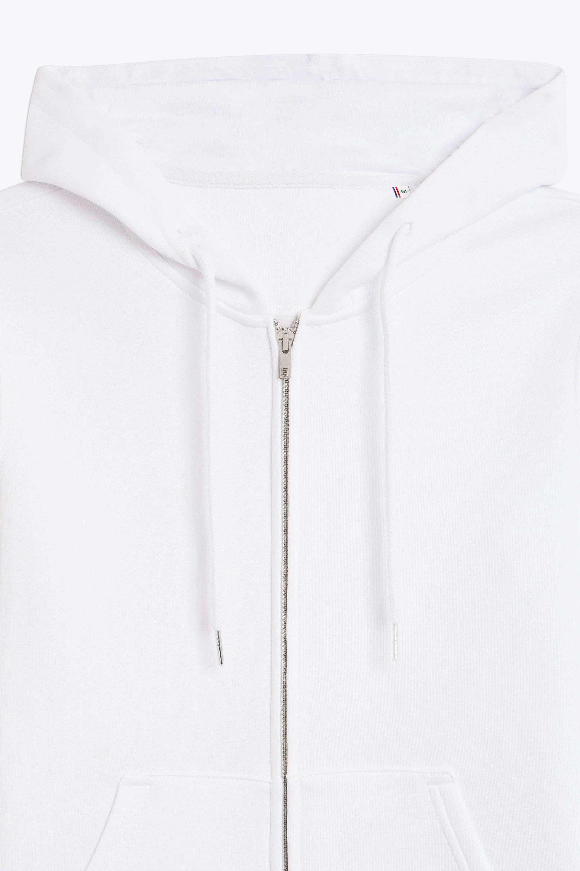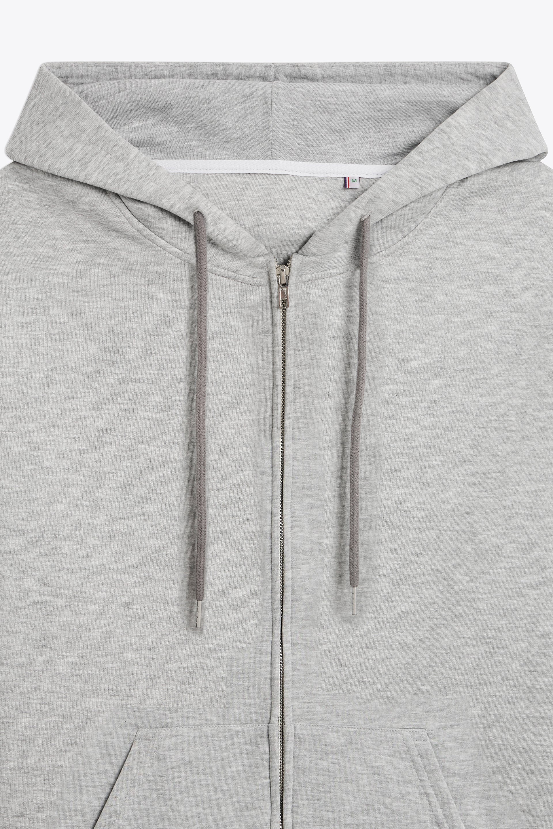 Coupe standard, coupé cousu,fermeture à glissière devant, capuche avec cordon embout métallique, bas des manches et du buste en bord cote 2x2, poche ventrale avec détail tricolore pincé poche gauche.