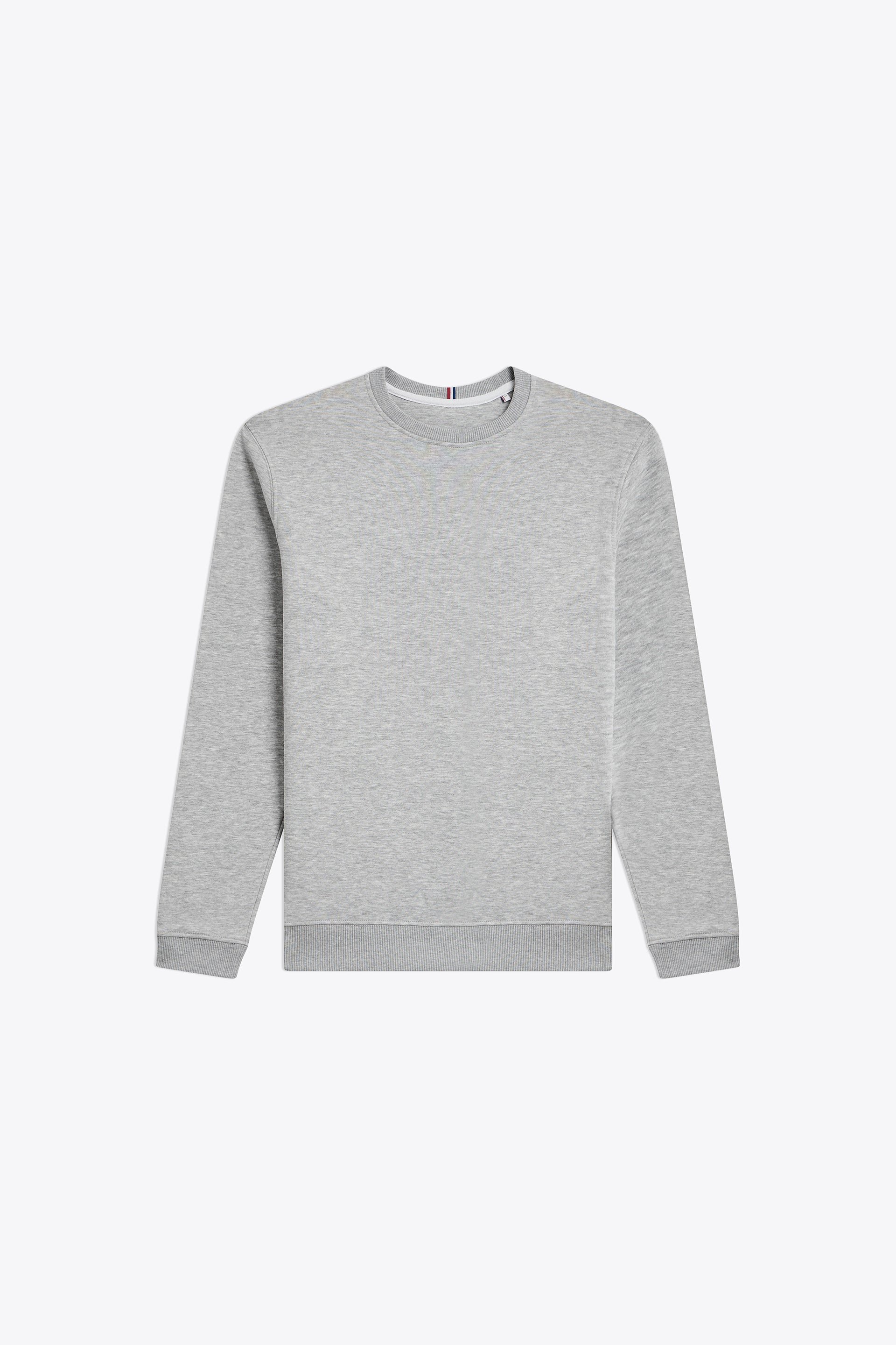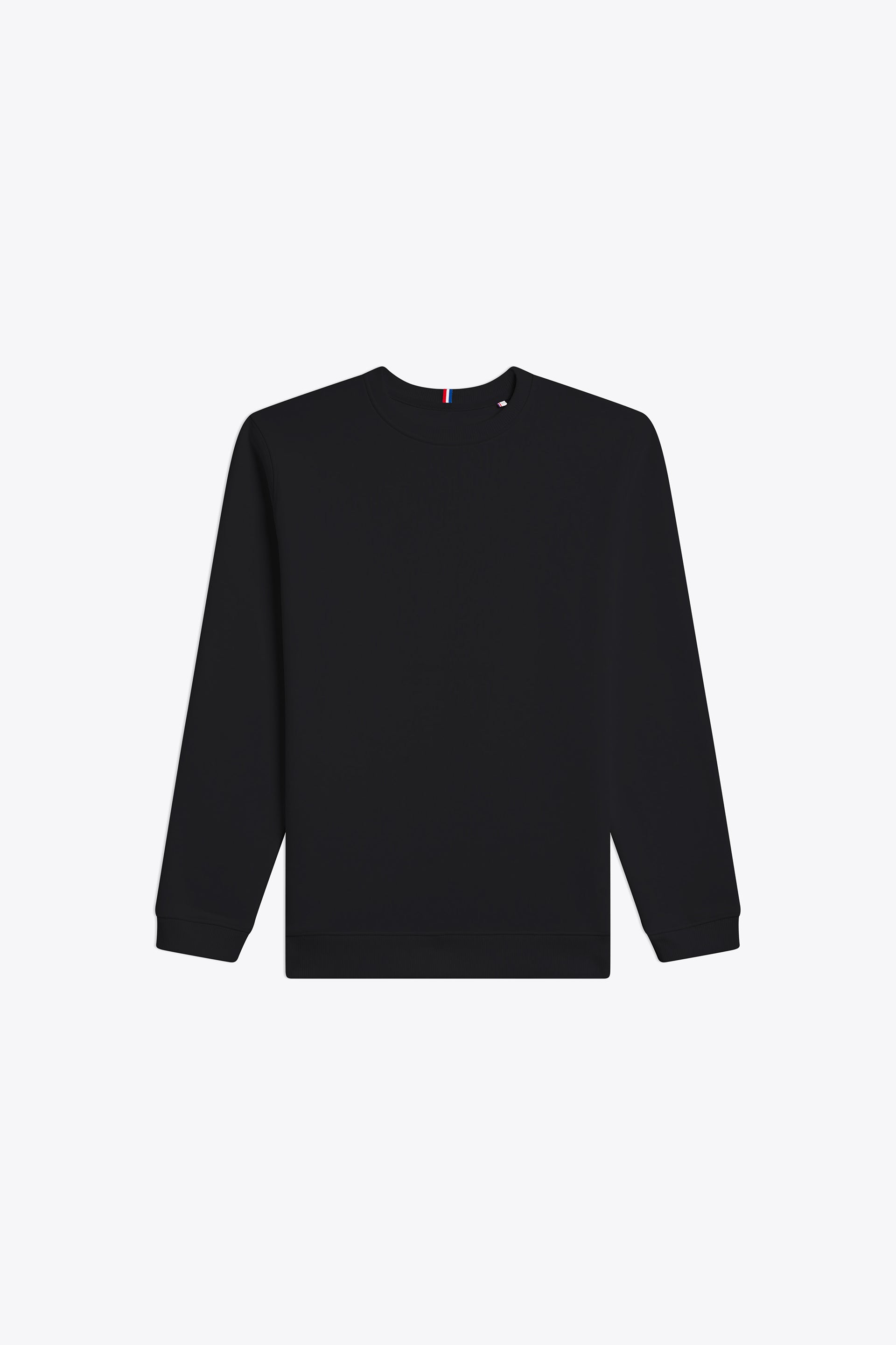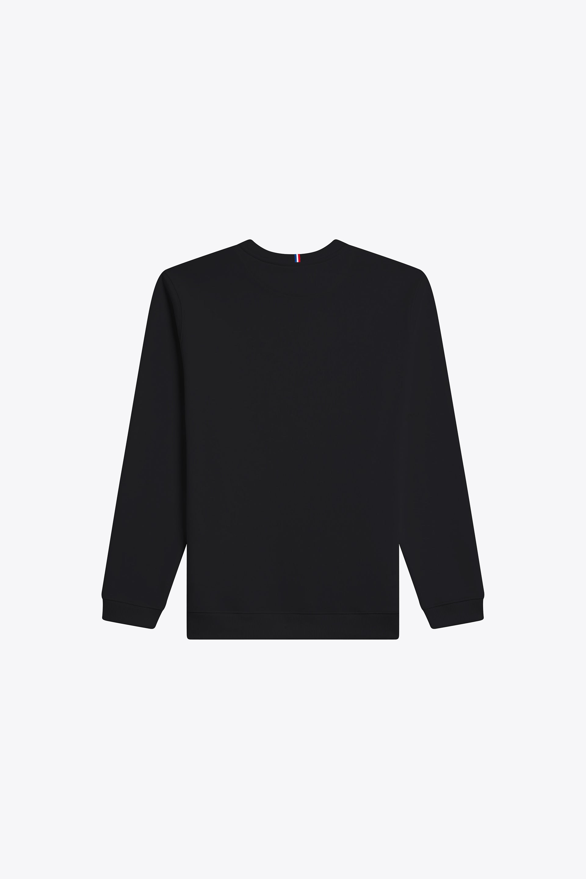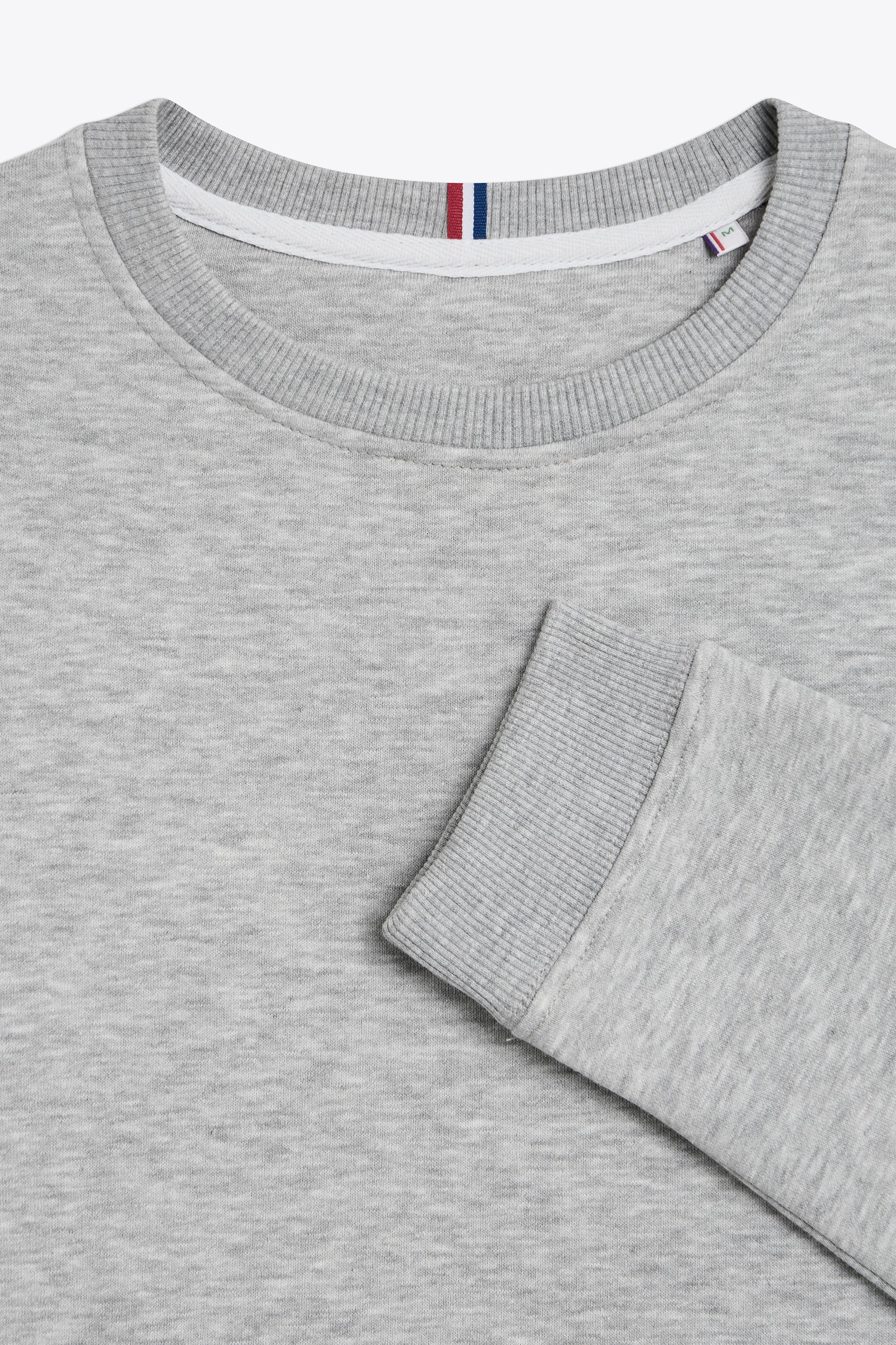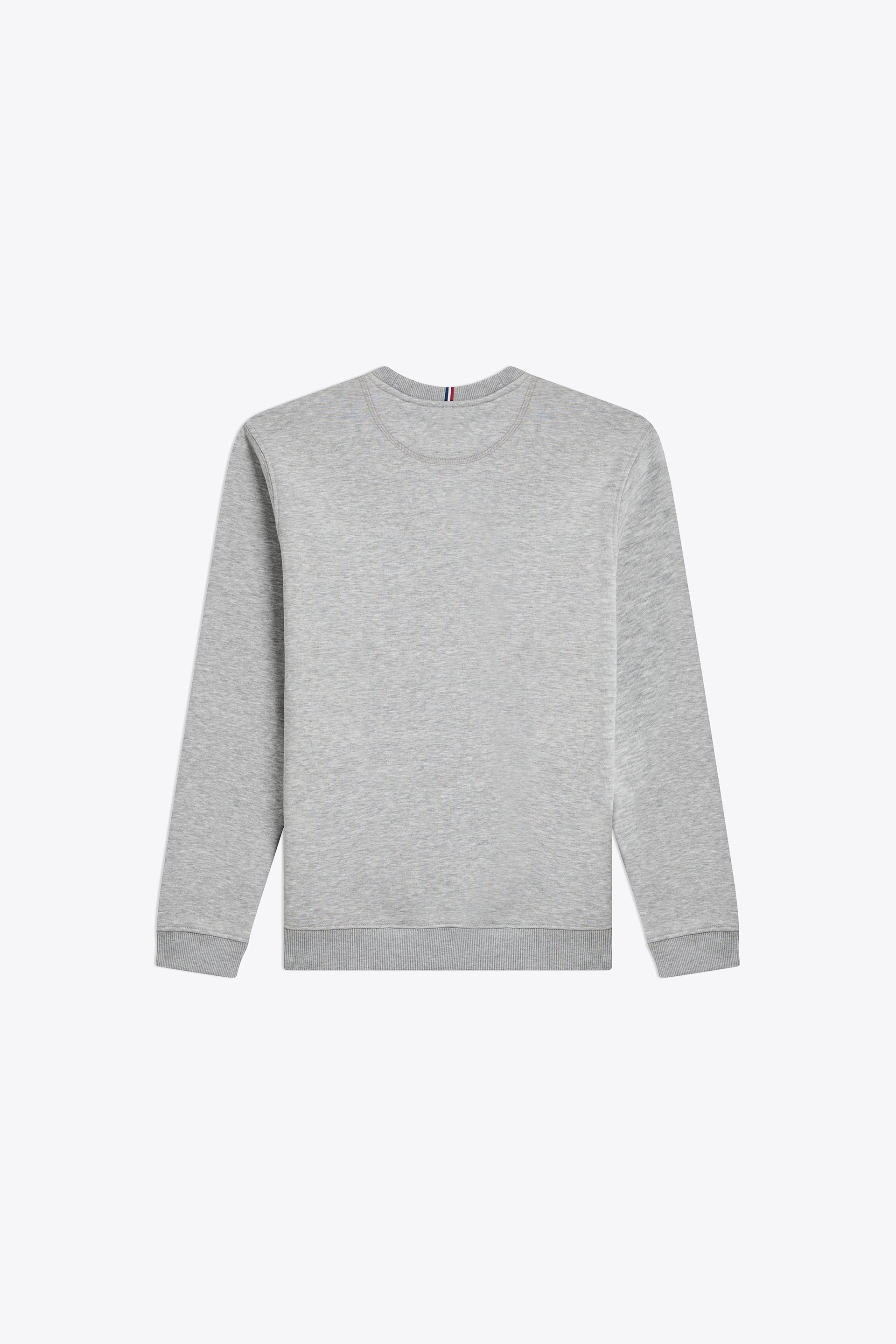 Coupe standard, coupé cousu, col rond, bas des manches et du buste en bord cote 2x2, détail tricolore centre col dos.